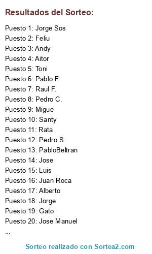 Lista de participantes: Aitor, Alberto, Andy, Anthony, Braulio, Carlos (Xarli), Feliu, Gato, Hector, Israel, Jorge, Jorge Sos, Jose, Juan Milanes, Juan Roca, Luis, Migue, Pablo F., PabloBeltran, Pedro C., Pedro S., Rata, Raul F., Santy, Tavi, Tena, Toni, Jose Manuel, Ximo.