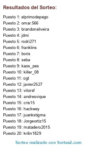 Lista de participantes: javier2527, Jorgeortiz15, andresvique, boris, jdmi, hackwey, cris15, seba, matadero2015, elprimodepego, rodri271, killer_08, ogt, omar.566, krilin1829, franklins, vitorsf, brandonsilveira, kaos_pes, juankstigma.