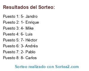 Lista de participantes: 1- Enrique, 2- Pablo, 3- Andrés, 4- Mike, 5- Jandro, 6- Luis, 7- Héctor, 8- Carlos.