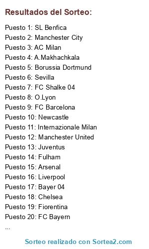 Lista de participantes: FC Bayern, FC Shalke 04, Borussia Dortmund, Bayer 04, Atletico de Madrid, FC Barcelona, Real Madrid, Valencia, Sevilla, Malaga, PSG, Lille, O.Lyon, Marsella, Arsenal, Manchester City, Chelsea, Manchester United, Newcastle, Everton, Fulham, Liverpool, Spurs, Internazionale Milan, AC Milan, Juventus, Roma, Fiorentina, Lazio, Napoli, FC oporto, SL Benfica, Sporting CP, Zenit, A.Makhachkala.