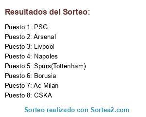 Lista de participantes: Borusia, Arsenal, Ac Milan, CSKA, Napoles, Livpool, Spurs(Tottenham), PSG.