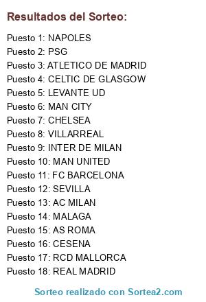 Lista de participantes: AC MILAN, AS ROMA, ATLETICO DE MADRID, CELTIC DE GLASGOW, CESENA, CHELSEA, FC BARCELONA, INTER DE MILAN, LEVANTE UD, MALAGA, MAN UNITED, MAN CITY, NAPOLES, PSG, RCD MALLORCA, REAL MADRID, SEVILLA, VILLARREAL.
