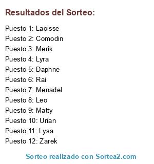 Lista de participantes: Matty, Leo, Menadel, Rai, Lysa, Zarek, Merik, Lyra, Urian, Laoisse, Daphne, Comodin.