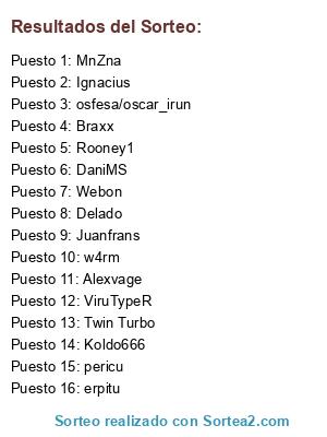 Lista de participantes: Braxx, Webon, Alexvage, Rooney1, ViruTypeR, Juanfrans, Koldo666, Ignacius, Twin Turbo, DaniMS, w4rm, osfesa/oscar_irun, pericu, erpitu, MnZna, Delado.