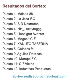 Lista de participantes: KANUTO TABERNA, Megabit C.F, Malaka 88, Aguilas Doradas, Marapa F.C, Industrias Pesqueras, Hts_Luckytaggg, La Jaca F.C, Guindos fc, S.D.Nostromo, Llosoigrut Aventer, C.F.Vielha.