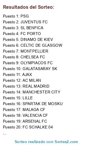 Lista de participantes: PSG, FC PORTO, DINAMO DE KIEV, DINAMO DE ZAGREB, FC SCHALKE 04, ARSENAL FC, OLYMPIACOS FC, MONTPELLIER, MALAGA CF, AC MILAN, ZENIT SAN PETERSBURGO, REAL MADRID, AJAX, MANCHESTER CITY, JUVENTUS FC, SHAKTAR DONETSK, CHELSEA FC, NORDSJAELLAND, BAYERN MUNCHEN, VALENCIA CF, LILLE, FC BARCELONA, CELTIC DE GLASGOW, SL BENFICA, SPARTAK DE MOSKU, MANCHESTER UNITED, GALATASARAY SK, SC BRAGA.