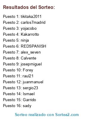 Lista de participantes: Forey, Garrido, raul21, tikitaka2011, sady, REDSPANISH, Ismael, Kakarrotto, ninja, juanmanuel, alex_seven, Calvente, carlos7madrid, yojacobo, josepmiguel, sergio23.