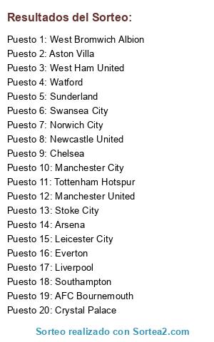 Lista de participantes: AFC Bournemouth, Arsena, Aston Villa, Chelsea, Crystal Palace, Everton, Leicester City, Liverpool, Manchester City, Manchester United, Newcastle United, Norwich City, Southampton, Stoke City, Sunderland, Swansea City, Tottenham Hotspur, Watford, West Bromwich Albion, West Ham United.