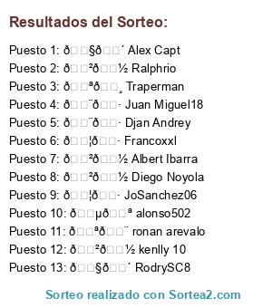 Lista de participantes: 🇧🇴 RodrySC8, 🇲🇽 Diego Noyola, 🇪🇨 ronan arevalo, 🇧🇴 Alex Capt, 🇵🇪 alonso502, 🇨🇷 Djan Andrey, 🇦🇷 JoSanchez06, 🇲🇽 Albert Ibarra, 🇦🇷 Francoxxl, 🇨🇷 Juan Miguel18, 🇲🇽 kenlly 10, 🇲🇽 Ralphrio, 🇪🇸 Traperman.