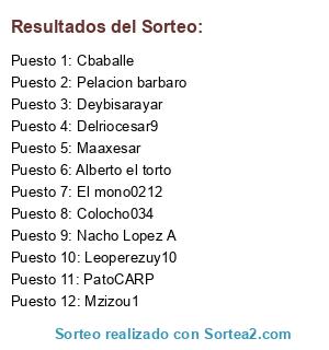 Lista de participantes: Pelacion barbaro, Alberto el torto, Nacho Lopez A, El mono0212, Delriocesar9, Deybisarayar, Leoperezuy10, Mzizou1, PatoCARP, Maaxesar, Colocho034, Cbaballe.