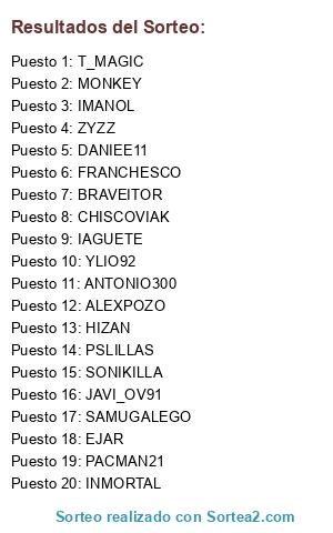 Lista de participantes: EJAR, HIZAN, ALEXPOZO, IAGUETE, YLIO92, PSLILLAS, T_MAGIC, CHISCOVIAK, SAMUGALEGO, ZYZZ, INMORTAL, MONKEY, SONIKILLA, IMANOL, FRANCHESCO, BRAVEITOR, ANTONIO300, PACMAN21, DANIEE11, JAVI_OV91.