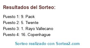 Lista de participantes: 1. Rayo Vallecano, 2. Celta, 3. Cardiff City, 4. Evian Thonon, 5. Twente, 6. Chievo Verona, 7. Cruz Azul, 8. Palmeiras, 9. Paok, 10. Rubin Kazan, 11. Basilea, 12. Augsburgo, 13. Boca Juniors, 14. Brujas, 15. Deportes Tolima, 16. Copenhague.