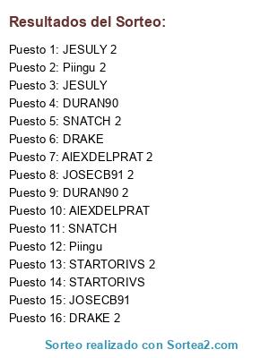 Lista de participantes: STARTORIVS, JOSECB91, JESULY, DURAN90, AlEXDELPRAT, SNATCH, DRAKE, Piingu, STARTORIVS 2, JOSECB91 2, JESULY 2, DURAN90 2, AlEXDELPRAT 2, SNATCH 2, DRAKE 2, Piingu 2.
