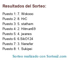 Lista de participantes: 1. Sukipei, 2. Hitman69, 3. Nenefer, 4. jwanes, 5. statham, 6.SikO124, 7. Wokooo, 8. HrC.