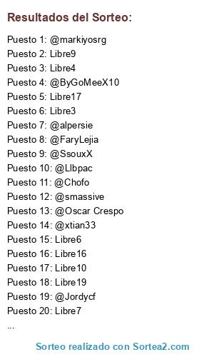 Lista de participantes: @Jaimito, @Jordycf, @SsouxX, @xtian33, @Alejandro, @Marc, @Llbpac, @alpersie, @Ayo83xbox, @yoyito88, @Juan, @gcamacho, @ByGoMeeX10, @FaryLejia, @Oscar Crespo, @smassive, @markiyosrg, @Chofo, @gabito09, @Forsito, Libre, Libre1, Libre2, Libre3, Libre4, Libre5, Libre6, Libre7, Libre8, Libre9, Libre10, Libre11, Libre12, Libre13, Libre14, Libre15, Libre16, Libre17, Libre18, Libre19.