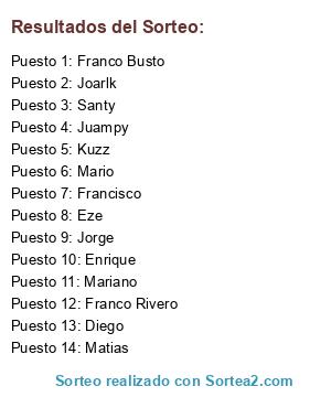 Lista de participantes: Franco Rivero, Jorge, Eze, Mariano, Matias, Franco Busto, Diego, Mario, Kuzz, Joarlk, Enrique, Francisco, Juampy, Santy.
