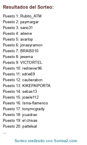 Lista de participantes: avarlop, Rubito_ATM, Isma-flamenco, aiteme, VICTORTEL, pattelsal, jcuadrao, cauberabcn, sdrie69, jesema, sebasfgar9, el chivas, sebas13, KIKEPAIPORTA, paymargar, tonymcgrady, rock team, josele112, jonasyramon, sano31, rednever96, xampa92, jose_medi, BRAIS010.