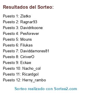 Lista de participantes: CiriverO, Daviddamores81, Mouns, Filukas, Ricardgol, Nacho_col, Ragnar93, Pesforever, Davidrikoone, Eckae, Zlatko, Herny_rambo.