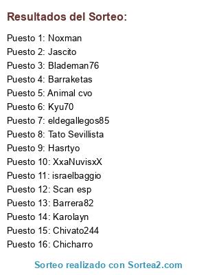 Lista de participantes: Blademan76, israelbaggio, Barrera82, XxaNuvisxX, Jascito, Chivato244, Tato Sevillista, Animal cvo, Karolayn, Hasrtyo, Kyu70, Noxman, Chicharro, Scan esp, Barraketas, eldegallegos85.