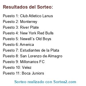 Lista de participantes: San Lorenzo de Almagro, River Plate, Boca Juniors, Velez, Newell´s Old Boys, Estudiantes de la Plata, Club Atletico Lanus, Millonarios FC, New York Red Bulls, Monterrey, America.