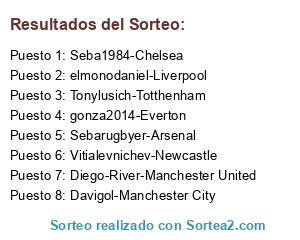 Lista de participantes: Diego-River-Manchester United, Seba1984-Chelsea, elmonodaniel-Liverpool, Sebarugbyer-Arsenal, gonza2014-Everton, Davigol-Manchester City, Tonylusich-Totthenham, Vitialevnichev-Newcastle.
