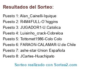 Lista de participantes: FARAON-CALAMAR-U.de Chile, JUGADOR1-U.Catolica, Luisinho_crack-Cobreloa, Tottomet1986-Colo Colo, Alan_Cainelli-Iquique, JCartes-Huachipato, ashe-star-Union Española, R4M4FULL-O´higgins.