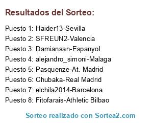 Lista de participantes: Pasquenze-At. Madrid, elchila2014-Barcelona, SFREUN2-Valencia, alejandro_simoni-Malaga, Chubaka-Real Madrid, Haider13-Sevilla, Fitofarais-Athletic Bilbao, Damiansan-Espanyol.