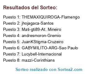 Lista de participantes: jhojagaca-Santos, GABYMILITO-ARG-Sao Paulo, mazzi-Corinthians, JuanKStigma-Cruzeiro, Lucybell-Internacional, Mati-gti89-At. Mineiro, THEMAXIQUIROGA-Flamengo, andresmoron-Gremio.
