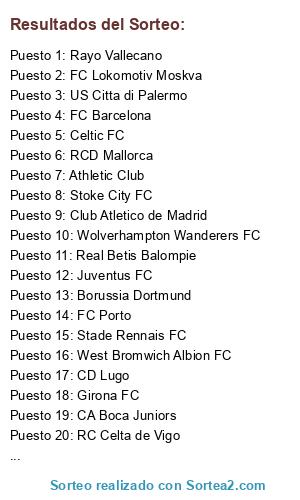 Lista de participantes: CA Boca Juniors, Wolverhampton Wanderers FC, Real Betis Balompie, Celtic FC, US Citta di Palermo, RC Deportivo de La Coruña, RCD Mallorca, Girona FC, RC Celta de Vigo, Borussia Dortmund, Real Madrid CF, Juventus FC, FC Porto, Athletic Club, AS Roma, FC Lokomotiv Moskva, Stade Rennais FC, CD Lugo, Rayo Vallecano, LOSC Lille, West Bromwich Albion FC, FC Barcelona, Club Atletico de Madrid, Stoke City FC.