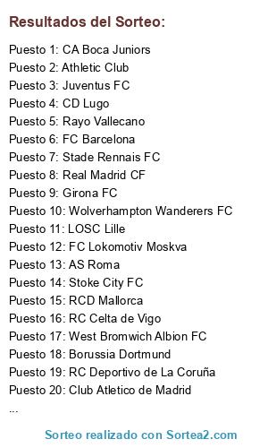 Lista de participantes: CA Boca Juniors, Wolverhampton Wanderers FC, Real Betis Balompie (Solok), Celtic FC, US Citta di Palermo, RC Deportivo de La Coruña, RCD Mallorca, Girona FC, RC Celta de Vigo, Borussia Dortmund, Real Madrid CF, Juventus FC, FC Porto (carrijl), Athletic Club, AS Roma, FC Lokomotiv Moskva, Stade Rennais FC, CD Lugo, Rayo Vallecano, LOSC Lille, West Bromwich Albion FC, FC Barcelona, Club Atletico de Madrid, Stoke City FC.