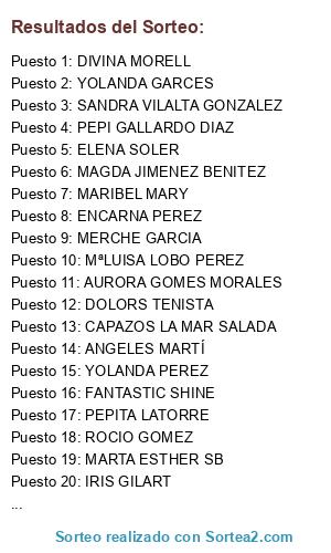 Lista de participantes: ENCARNA PEREZ, PEPITA LATORRE, DOLORS TENISTA, MªLUISA LOBO PEREZ, DIVINA MORELL2, DIVINA MORELL, ELENA SOLER, YOLANDA GARCES, GEMMA SANJUÁN, CAPAZOS LA MAR SALADA, CAMELIA SAURI FUENTES, BEA NAVARRO MIROT, PEPI GALLARDO DIAZ, ANNA V.ROIG CASTAN, IRIS GILART, MROSA ARDEVOL, MERCHE GARCIA, LLÚCIA MASIP, MARIBEL MARY, MAGDA JIMENEZ BENITEZ, YOLANDA PEREZ, IMMA CASTRO HUGUET, AURORA GOMES MORALES, ANGELES MARTÍ, FANTASTIC SHINE, ROCIO GOMEZ, GLORIA GARCIA, SANDRA VILALTA GONZALEZ, MARTA ESTHER SB.