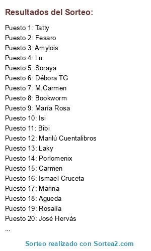 Lista de participantes: Agueda (9 participaciones), Bibi(9 participaciones), Débora TG (9 participaciones), Bookworm (5 participaciones), Carmen (5 participaciones), Marina (5 participaciones), Fesaro (9 participaciones), José Hervás (9 participaciones), Marilú Cuentalibros(9 participaciones), Soraya (9 participaciones), María Rosa (7 participaciones), Porlomenix (6 participaciones), Javier(7 participaciones), Rosalía (7 participaciones), M.Carmen(9 participaciones), Laky (9 participaciones), Ismael Cruceta (7 participaciones), Pilu, Lu (9 participaciones), Tatty (9 participaciones), Isi (5 participaciones), Amylois (8 participaciones), Amylois.