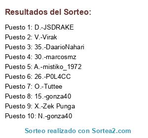 Lista de participantes: 1.-mistiko_1972, 2.-GranComander, 3.-estanild2, 4.-JSDRAKE, 5.-C. A. Huracan, 6.-vincent14, 7.-WolverYisus, 8.-rosariocanalla, 9.-Doncella Carol, 10.-Leuhen, 11.-Tairefer, 12.-mariano23, 13.-gbarberon, 14.-Marcelo Alejandro Zarate, 15.-gonza40, 16.-fernetzero, 17.-Tuttee, 18.-Stenka Razin, 19.-Leo Howell, 20.-Nazareno1982, 21.-Artigascba, 22.-empaladeradefede, 23.-Marchao, 25.-Virak, 26.-P0L4CC, 27.-Gugatzu, 28.-Zek Punga, 29.-Sebastianolazabal, 30.-marcosmz, 31.-FUERZAINMORTAL, 32.-Aimar Jesus, 33.-cneyra, 34.-Dragoshark 3.0, 35.-DaarioNahari, A.-mistiko_1972, B.-GranComander, C.-estanild2, D.-JSDRAKE, E.-C. A. Huracan, F.-vincent14(D), G.-rosariocanalla, H.-Doncella Carol, I.-Leuhen, J.-Tairefer, K.-mariano23, L.-gbarberon, M.-Marcelo Alejandro Zarate, N.-gonza40, Ñ.-fernetzero, O.-Tuttee, P.-Stenka Razin, Q.-Leo Howell, R.-Nazareno1982, S.-Artigascba, T.-empaladeradefede, V.-Virak, U.-P0L4CC, W.-Gugatzu, X.-Zek Punga, Y.-Sebastianolazabal, Z.-marcosmz, AA.-FUERZAINMORTAL, BB.-cneyra, CC.-Dragoshark 3.0.