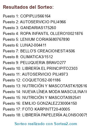Lista de participantes: ROPA INFANTIL OLLERO10021851, ROPA INFANTIL OLLERO10021853, AUTOSERVICIO PILI4969, NATURHOUSE CORIAT/285, LUNA2-004382, NUEVA LÍNEA MODA MASCULINA1003554, LUNA2-004383, BELLO'S CREACIONES1/4459, AUTOSERVICIO PILI4975, AUTOSERVICIO PILI4974, AUTOSERVICIO PILI4973, ROPA INFANTIL OLLERO10021854, COMERCIAL PACHECO000561, AUTOSERVICIO PILI4977, IDEA OLIVERA1783, DOMIGO VISTE33696, ROPA INFANTIL OLLERO10021855, COMERCIAL PACHECO562, LIBRERÍA PAPELERÍA ALONSO0001, LIBRERÍA PAPELERÍA ALONSO0002, GANDARIAS33825, FARMACIA MERCEDES PASCUAL ECHÁVARRID-007221, EMILIO GONZALEZ230003908, BELLO'S CREACIONEST/4462, COMERCIAL PACHECO564, ROPA INFANTIL OLLERO10021856, ROPA INFANTIL OLLERO10021857, NUEVA LÍNEA MODA MASCULINA0003555, COQUETOS2-001105, COQUETOS2-001104, COQUETOS851, COMERCIAL PACHECO1-000563, LUNA2-004384, LIBRERÍA PAPELERÍA ALONSO0006, EL MUNDO DEL NIÑO29970, EMILIO GONZALEZ230003912, LUNA2-004385, LUNA2-004387, AUTOSERVICIO PILI4981, EMILIA PERFUMERÍA145882, NUEVA LÍNEA MODA MASCULINA1003556, NUEVA LÍNEA MODA MASCULINA1003557, FOTO KARPINTT20-39983, LUNA2-004388, COMERCIAL PACHECO565, GANDARIAS175255, ROPA INFANTIL OLLERO10021861, ROPA INFANTIL OLLERO100214858, ROPA INFANTIL OLLERO10021859, LIBRERÍA EL PRINCIPITO2218, LIBRERÍA EL PRINCIPITO2217, ROPA INFANTIL OLLERO10021860, NUEVA LÍNEA MODA MASCULINA1003558, LUNA2-004389, DOMIGO VISTE33828, DOMIGO VISTE33829, "FERRETERÍA OLIVERA S.L, 1CFS/1782", EMILIO GONZALEZ230003941, BELLO'S CREACIONEST/4476, NUEVA LÍNEA MODA MASCULINA1003559, LIBRERÍA PAPELERÍA ALONSO0007, LIBRERÍA PAPELERÍA ALONSO0008, EL MUNDO DEL NIÑO29971, ROPA INFANTIL OLLERO10021863, EL MUNDO DEL NIÑO29972, EL MUNDO DEL NIÑO29973, EL MUNDO DEL NIÑO29974, DOMIGO VISTE33826, ROPA INFANTIL OLLERO10021864, LIBRERÍA PAPELERÍA ALONSO0017, NUTRICIÓN Y MASCOTAS92540, ROPA INFANTIL OLLERO10021865, EL MUNDO DEL NIÑO29975, LIBRERÍA PAPELERÍA ALONSO0019, IDEA OLIVERA1CFS/1786, LUNA2-004390, LIBRERÍA PAPELERÍA ALONSO0016, LIBRERÍA PAPELERÍA ALONSO14, LIBRERÍA PAPELERÍA ALONSO0015, LUNA2-004391, EL MUNDO DEL NIÑO29976, NUTRICIÓN Y MASCOTAS92541, LENIUM CORIA5680767260, ZAPATERÍA INFANTIL ABRACADABRA0011427, ZAPATERÍA INFANTIL ABRACADABRA001427, BELLO'S CREACIONESY/4502, EL MUNDO DEL NIÑO29980, NUTRICIÓN Y MASCOTAS92543, EL MUNDO DEL NIÑO29979, EL MUNDO DEL NIÑO29978, EL MUNDO DEL NIÑO29977, BELLO'S CREACIONEST/4470, LIBRERÍA EL PRINCIPITO2221, LIBRERÍA EL PRINCIPITO2226, BELLO'S CREACIONEST/4506, NUTRICIÓN Y MASCOTAS92546, CAMPESANO132398, A&D MODA INFANTIL25845, A&D MODA INFANTIL25844, LIBRERÍA PAPELERÍA ALONSO0021, BELLO'S CREACIONEST/4509, PELUQUERIA BRAVO249, BELLO'S CREACIONEST/4510, AUTOSERVICIO PILI4986, COPIPLUS65936, COPIPLUS65937, CAMPESANOVC2T/ 132.400, CAMPESANOVC2T/132.429, AUTOSERVICIO PILI4993, LIBRERÍA PAPELERÍA ALONSO0022, EMILIO GONZALEZ230003949, CAMPESANO132, NUEVA LÍNEA MODA MASCULINA1003562, DOMIGO VISTE33839, CAMPESANOVC2T/132.448, AUTOSERVICIO PILI4997, COPIPLUS65941, EVA REYES MODA Y COMPLEMENTOST/266, EL MUNDO DEL NIÑO29982, CAMPESANOVc2t/132.457, AUTOSERVICIO PILI4998, AUTOSERVICIO PILI4999, NUTRICIÓN Y MASCOTAS92550, AUTOSERVICIO PILI5000, BELLO'S CREACIONES4504, EMILIO GONZALEZ230003952, ROPA INFANTIL OLLERO10021867, EL MUNDO DEL NIÑO29983, AUTOSERVICIO PILI4976, AUTOSERVICIO PILI4968, NUTRICIÓN Y MASCOTAS92553, AUTOSERVICIO PILI4970, AUTOSERVICIO PILI4971, CAMPESANOVC2T/132413, AUTOSERVICIO PILI4966, AUTOSERVICIO PILI4979, AUTOSERVICIO PILI4978, AUTOSERVICIO PILI4980, AUTOSERVICIO PILI4984, AUTOSERVICIO PILI4985, ROPA INFANTIL OLLERO10021868, AUTOSERVICIO PILI4987, AUTOSERVICIO PILI5002, ROPA INFANTIL OLLERO10021869, DOMIGO VISTE33845, NUTRICIÓN Y MASCOTAS92558, NUTRICIÓN Y MASCOTAS92557, ROPA INFANTIL OLLERO10021870, NUTRICIÓN Y MASCOTAS92548, LIBRERÍA PAPELERÍA ALONSO0024, LIBRERÍA PAPELERÍA ALONSO0023, NUEVA LÍNEA MODA MASCULINA1003563, TERESA MAYOT10/35326, LIBRERÍA PAPELERÍA ALONSO0025, COPIPLUS65956, COPIPLUS65957, NUEVA LÍNEA MODA MASCULINA1003564, COPIPLUS65954, COPIPLUS65958, COPIPLUS65959, NUEVA LÍNEA MODA MASCULINA1003565, NUTRICIÓN Y MASCOTAS92563, LENIUM CORIA5680767570, AUTOSERVICIO PILI4996, BODEGAS VALDEPEÑAS DE CORIA S.L.Fc-23-10000512, CAMPESANOVC2T/132536, AUTOSERVICIO PILI4995, NUTRICIÓN Y MASCOTAS92564, NUTRICIÓN Y MASCOTAS92567, EMILIO GONZALEZ230003986, LIBRERÍA EL PRINCIPITO2236, EL MUNDO DEL NIÑO29984, NUEVA LÍNEA MODA MASCULINA1003566, NUTRICIÓN Y MASCOTAS92569, LUNA2-004392, ROPA INFANTIL OLLERO10021871, CAMPESANOVC2T/132.471, CAMPESANOVC2T/132.458, NUTRICIÓN Y MASCOTAS92571, BELLO'S CREACIONEST/4533, BELLO'S CREACIONEST/4534, ROPA INFANTIL OLLERO10021872, ROPA INFANTIL OLLERO10021873, CAMPESANOVC2T/132.563, LIBRERÍA PAPELERÍA ALONSO0028, LIBRERÍA PAPELERÍA ALONSO0029, "PASTELERÍA EL PINTOR#:00001, ", PELUQUERIA BRAVO250, BELLO'S CREACIONEST/4535, BELLO'S CREACIONEST/4536, LIBRERÍA EL PRINCIPITO2243, FOTO KARPINTT20-39986, LIBRERÍA PAPELERÍA ALONSO0030, NUEVA LÍNEA MODA MASCULINA1003569, LIBRERÍA EL PRINCIPITO2235, LIBRERÍA PAPELERÍA ALONSO0031, NUTRICIÓN Y MASCOTAS92573, COQUETOS001123, BELLO'S CREACIONEST/4537, BELLO'S CREACIONEST/4482, A&D MODA INFANTIL25856, NUTRICIÓN Y MASCOTASTK/92574, LIBRERÍA EL PRINCIPITO2237, EVA REYES MODA Y COMPLEMENTOS267, BELLO'S CREACIONEST/4495, LIBRERÍA EL PRINCIPITO2241, AUTOSERVICIO PILI5006, MODIMELA CORIA23/10517, AUTOSERVICIO PILI5007, MIREN2140, BELLO'S CREACIONES4540, NUTRICIÓN Y MASCOTAS92578, MIREN2141, A&D MODA INFANTIL25859, LUNA2-004393, COPIPLUS65984, LIBRERÍA EL PRINCIPITO2251, AUTOSERVICIO PILI5011, EMILIO GONZALEZ230003993, FOTO KARPINTT20-39988, PELUQUERIA BRAVO253, JUGUETERÍA PAMDAT23/400, ROPA INFANTIL OLLERO10021875, ROPA INFANTIL OLLERO10021876, ROPA INFANTIL OLLERO10021878, ROPA INFANTIL OLLERO10021877, NUEVA LÍNEA MODA MASCULINA1003571, AUTOSERVICIO PILI5013, ROPA INFANTIL OLLERO10021879, NUTRICIÓN Y MASCOTAS92584, CAMPESANO132669, PELUQUERIA BRAVO252, AUTOS
