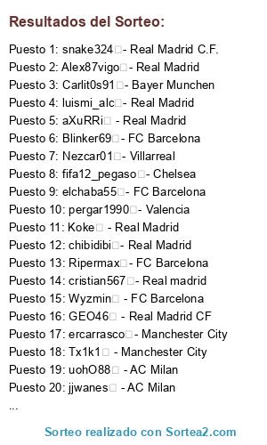 Lista de participantes: Wyzmin - FC Barcelona, Corlevito - Real Madrid, GEO46 - Real Madrid CF, Lobeznorm - AC MILAN, Nezcar01 - Villarreal, Koke - Real Madrid, jeskobdn - Chelsea C.F, aXuRRi - Real Madrid, Carlit0s91 - Bayer Munchen, jjwanes - AC Milan, ercarrasco - Manchester City, uohO88 - AC Milan, Tx1k1 - Manchester City, luismi_alc - Real Madrid, snake324 - Real Madrid C.F., elchaba55 - FC Barcelona, Escroto2_Samcro - Real Madrid, pergar1990 - Valencia, Blinker69 - FC Barcelona, Ripermax - FC Barcelona, chibidibi - Real Madrid, fifa12_pegaso - Chelsea, cristian567 - Real madrid, Alex87vigo - Real Madrid.