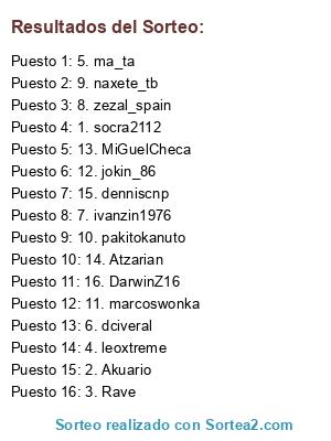 Lista de participantes: 1. socra2112, 2. Akuario, 3. Rave, 4. leoxtreme, 5. ma_ta, 6. dciveral, 7. ivanzin1976, 8. zezal_spain, 9. naxete_tb, 10. pakitokanuto, 11. marcoswonka, 12. jokin_86, 13. MiGuelCheca, 14. Atzarian, 15. denniscnp, 16. DarwinZ16.