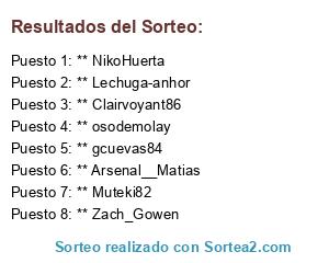 Lista de participantes: ** NikoHuerta, ** Zach_Gowen, ** osodemolay, ** Arsenal__Matias, ** gcuevas84, ** Clairvoyant86, ** Lechuga-anhor, ** Muteki82.