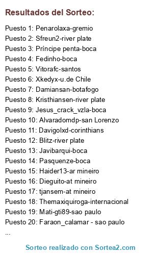 Lista de participantes: tjansem-at mineiro, Jaicolle-boca, Haider13-ar mineiro, Damiansan-botafogo, Sebacasla-san Lorenzo, Sfreun2-river plate, Jhojagaca-ar mineiro, Mou27-river plate, Sfreun-boca, Sebarugbyer-sao paulo, Fitofarais-cruzeiro, Luisinho_crack - cruzeiro, Fedinho-boca, Guasti-san Lorenzo, Faraon_calamar - sao paulo, Lucybell-colo colo, Mad_evil-corinthians, Alvaradomdp-san Lorenzo, Blitz-river plate, Juankstigma-at. Mineiro, Davigolxd-corinthians, Vitorafc-santos, Javibarqui-boca, Xkedyx-u.de Chile, Mattmolina-boca, Arku-boca, Jagerx-newells, Kurilin-river plate, Mati-gti89-sao paulo, jugador1-u. de Chile, Rafael-pro - palmeiras, Diegoweed-u.de Chile, Dieguito-at mineiro, Elchila2014-ar mineiro, Penarolaxa-gremio, Pasquenze-boca, Jesus_crack_vzla-boca, Lucianocareso-audaz italiano, R4m4full-boca, Tonylusich-corinthians, Chubaka-colo colo, Anibalito-at mineiro, Tin-boca, Themaxiquiroga-internacional, Kristhiansen-river plate, Elmonodaniel-sao paulo, Príncipe penta-boca, Diego-river - river plate.