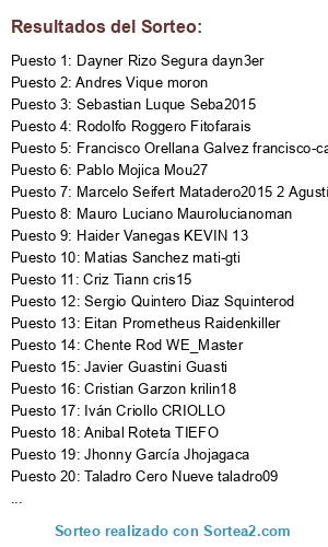 Lista de participantes: Brandon Silveira Brandonsilveira, Mauro Luciano Maurolucianoman, Iván Criollo CRIOLLO, Boris AcUña Pereira Boris_azul25, Marcelo Seifert Matadero2015, Emaiden Pes Emaiden, Marcelo Seifert Matadero2015 2 Agustín seifert, Manuel Fernando David Kimimarofd, Taladro Cero Nueve taladro09, Andres Vique moron, Uver Chavez ogt, Russo Carlos Ariel russitooo, Hackwey Gett Chuletamx, Chente Rod WE_Master, Eitan Prometheus Raidenkiller, Fernando Capli ChapuCardetti, Federico Andres Manzano Ramirez Famr1989, Dayner Rizo Segura dayn3er, Lucas Leonardo Fernandez Lk20, Sergio Quintero Diaz Squinterod, Cristian Garzon krilin18, Jhonny García Jhojagaca, Rodolfo Roggero Fitofarais, Sebastian Luque Seba2015, Rodri Zamora Rodrii271, Pablo Mojica Mou27, Sergi Vidal Cardona elprimodepego, Anibal Roteta TIEFO, Criz Tiann cris15, Daniel Viscovi danipro, Juan Cruz Tabasso CABJjuan, Francisco Orellana Galvez francisco-cabj, Javier Guastini Guasti, Matías Pereyra Perufaso, Lautaro Viscovi LAViscovi, Matias Sanchez mati-gti, Rodrigo Juarez rodrigo2024, Haider Vanegas KEVIN 13.