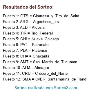 Lista de participantes: ALM = Almagro, CHA = Chacarita, CHI = Nueva_Chicago, PLA = Platense, CRU = Crucero_del_Norte, PAT = Patronato, GTS = Gimnasia_y_Tiro_de_Salta, SMA = CyBR_Santamarina_de_Tandil, ARG = Argentinos_Jrs, ALD = Aldosivi, SMT = San_Martin_de_Tucuman, TIR = Tiro_Federal.