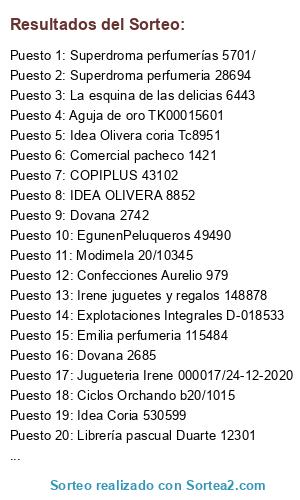 Lista de participantes: Peluquería Bravo TA672, Copiplus 43016, Irene juguetes regalos 148694, Irene juguetes regalos 148604, Deportes cronos 260958, Multiopticas 7317, Egumen peluqueros 49858, Foto-estudio karpint Tar-1400, Foto-estudio karpint T20-39565, DOVANA 2289, CONFECCIONES AURELIO 600, MC ZAPATOS 905, Fruteria mercadito T0403, aguja de oro TK00015581, Perfumería Esencias 2-003228, Abracadabra 2741, NAROGA 202,006,359, LUNA 2-027026, Juguetería Irene 000005/16-12-2020, Bellafarma T19/4195, Cesar Martín Alcala 9739, Librería Naroga 202,006,284, Farmacia Lda. Ma. Mercedes Pascual Echevarri D-051698, Frutería disfruta el mercadito M1T006, Frutería disfruta M1T007, Electrochash 73120, Comercial Pacheco 1402, Comercial Pacheco 1403, Retales Fran 8198, Dovana 2637, Peluquería Bravo 678, RETALES FRAN 8212, Bazar Sabbar 668, Gandarias 167448, Juguetería pamda 1704, Retales Fran textil y ropa de hogar 8213, Luna 2-027048, PRADO PLANTEL 9590, Idea coria TC 8840, Idea Coria 530597, Idea Coria 530599, Idea Coria 2889/ c, Deportes cronos 261100, Colorín colorado 2831, Calzados bernar 23252, Nutrición mascotas 75013, Nutrición mascotas 75015, Irene juguetes y regalos 148843, Sanguilinda retales 45046, Pm patricia mendo 612, Polo TC5/82754, Deportes cronos Cro/261137, Deportes cronos 261137, Deportes cronos Cro/261136, Teresa mayo T10/28116, Deportes cronos 261136, Retales fran 8193, Retales fran 8192, Dovana 2646, Confecciones Aurelio 868, Jugueteria pamda 1708, Juguetes Irene 000019 18-12-2020, Jugueteria pamda 1707, Mercería y lencería labores 90929, Fruteria mercadito T0019, Perfumhada 001522T, Le Velours 1-001343, FARMACIA MERCEDES PASCUAL D-018355, DOVANA 2645, Flichi Shop 1032, naroga 202006376, Flichi shop 1041, Retales fran 8224, Retales fran 7154, Retales fran 7155, Emilia perfumería 115408, Nutricion mascotas 75017, libreria Naroga 202006377, Prado plantel To0-9595, Los Malagueños T20/747, Le Velours 1-001344, Gandarias 167451, Nutricion mascotas 75018, Nutrición mascota 75021", Mercería lencería Labores 90935, Fruteria Mercadito M2-T0024, Fruteria Mercadito M2-T0025, El mundo del niño 23120, Confecciones Aurelio 886, Copiplus 43088, Superdroma 28640, ropa infantil ollero 10016478, Muebles Decorami V Garcia 7376, Retales fran 8229, PRADO PLANTEL 9597, Centro de estética Ana Lorenzo 132, FARAMCIA MERCEDES PASCUAL ECHAVARRI D-018357, PINTURAS MONCAR 4587, Juguetería Pamda 1604, NUTRICION MASCOTAS TK/74977, Juguetería Pamda 1713, Peluquería Bravo 679, Le Velours 1-001345, Dovana 2649, Retales fran 8218, Nutrición mascotas 75020, Dovana 2600, FRUTERÍA MERCADITO M2-T0035, FRUTERÍA MERCADITO M2-T0034, Juguetería Irene 000002/21-12-2020, ropa infantil ollero 10016479, PINTURAS MONCAR 4589, Juguetería Irene 000003/21-12-2020, Pamda T201714, libreria naroga 202006378, Nutricion mascotas 75022, Confecciones Aurelio 888, Multiopticas Noelia collado 7350, Patrícia Mendo 634, IdeaOlivera Tc8861, Zapateria abracadabra 2762, Idea Olivera C/2891, Zapatería abracadabra 2761, Librería Pascual duarte 12202, Teresa Mayo 28175, Zapatería abracadabra 2760, Zapatería abracadabra 2759, Colorín Colorado 2843, EL MUNDO DEL NIÑO 23134, Calzados bernar 23255, EL MUNDO DEL NIÑO 23135, Miren 5591, Miren 5701, Miren 5702, Retales Fran 8228, IDEA OLIVERA AC/530320, Merceria y lencería Labores 90938, Zapateria abracadabra 2755, libreria naroga 202006380, Peluquería Bravo 680, Zapatería abracadabra 2756, Zapateria abracadabra 2757, Calzados bernar 23256, Tienda Polo TC5/82793, Emilio Gonzalez Sánchez 200008608, Aguja de Oro 15585, Calzados bernar 23257, Multiopticas 2/0009324, Librería el principito 4918, Centro de Estética Ana Lorenzo 134, Centro de Estética Ana Lorenzo 133, farmacia mercedes pascual d-018365, libreria Naroga 202006381, Nutricion mascotas 75025, naroga 3758, Calzados bernar 23259, Idea olivera TZ8868, Retales Frqn Textil y Ropa de Hogar 8239, Retales Fran Textil y Ropa de Hogar 8240, Retales Fran 8242, Irene juguetes 148849, Jugueteria Irene 000004/21-12-2020, Jugueteria Irene 000005/21-12-2020, Nutricion mascotas 75026, Dovana 2651, Patricia mendo 494, Patricia mendo 492, Colorín Colorado 2845, Idea olivera TC/8870, Retales fran 6986, PATRICIA MENDO 633, MC ZAPATOS /COMPLEMENTOS 1220, Jugueteria pamda 1718, Miren 10005704, Jugueteria Irene 148684, Sanguilinda retales 45052, libreria naroga 202006382, Jugueteria Irene 0000007/21-12-2020, Naturhouse 837, JUGUETERIA PAMDA T20/1471, Irene juguetes y regalos 148845, Gandarias 167453, JUGUETERIA PAMDA T20/1706, Confecciones Aurelio 892, Idea olivera Tc8873, Idea Coria TC 8872, Jugueteria pamda 1719, Tienda POLO Tc5/82794, Viajes Rodríguez 2020/77, JUGUETERIA PANDA 1720, Retales Fran 8231, juguetera Irene 000010/21-12-2020, Idea Olivera C/2892, Nitricion mascotas 75027, FARMACIA MERCEDES PASCUAL D-018371, Comercial pacheco 1404, Comercial pacheco 1407, ROPA INFANTIL OLLERO 10016480", Dovana 2653, Librería el principito 4912, Jugueteria irene 000011/21/12/2020, Eva Reyes Moda y Complementos 411, Eva Reyes Moda y Complementos 412, Confecciones Aurelio 895, Farmacia Mercedes echavarri D-018359, Peluquería Bravo 682, Confecciones Aurelio 894, Librería El Principito 4922, Modimela 20/10302, ROPA INFANTIL OLLERO 10016481, Egumen 49325, Nutricion mascotas 75028, Esencias 2-003230, La Casita de Lara 1188, naroga 3760, Esencias 2-003232, Superdroma 28647, La Nava SLU D-018165, Confecciones Aurelio 896, Jugueteria Irene 000015/21-12-2020, Colorín Colorado 8871, libreria naroga 202006384, La Nava SLU D-018225, Modimela 20/10303, Idea olivera TC/8.797, Estética lidia Sánchez FS01-47, Tienda POLO Tc5/82796, Modimela 20/10304, AyD moda infantil 17798, Juguetería panda 1721, Jugueteria Irene 000016/21-12-2020, PATRICIA MENDO 635, Dovana 2655, Confecciones Aurelio 899, La rebotica S/10610, DEPORTES CRONOS CRO/261155, Gandarias 167454, Idea Coria TC 8875, FARMACIA MERCEDES PASCUAL ECHAVARRI D-018377, Calzados bernar 232