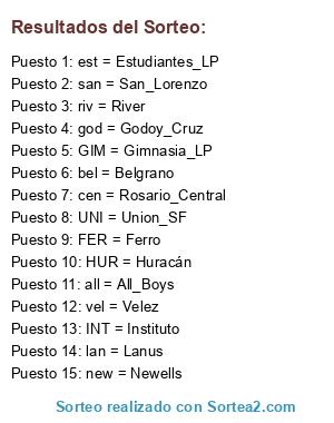 Lista de participantes: all = All_Boys, bel = Belgrano, est = Estudiantes_LP, god = Godoy_Cruz, lan = Lanus, new = Newells, riv = River, cen = Rosario_Central, san = San_Lorenzo, vel = Velez, HUR = Huracán, FER = Ferro, INT = Instituto, UNI = Union_SF, GIM = Gimnasia_LP.