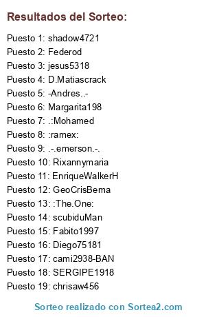 Lista de participantes: :ramex:, -Andres..-, cami2938-BAN, Fabito1997, GeoCrisBema, SERGIPE1918, Margarita198, shadow4721, :The.One:, .-.emerson.-., scubiduMan, jesus5318, Diego75181, EnriqueWalkerH, .:Mohamed, chrisaw456, Federod, Rixannymaria, D.Matiascrack.