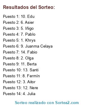 Lista de participantes: Khrys, Olga, Aitor, Julia, Iñigo, Asier, Pablo, Fermín, Juanma Celaya, Edu, Berta, Nere, Santi, Fabio.