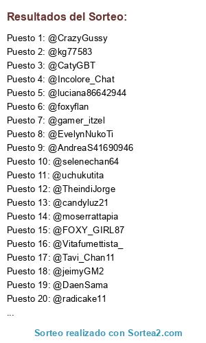 Lista de participantes: @Tifandub_Love , @animatowner2001, @DaenSama, @CatyGBT, @WillyUkeZ4, @foxyflan, @AndreaS41690946, @kg77583, @IzuhFtPatata, @EvelynNukoTi, @gamer_itzel , @FOXY_GIRL87, @EeveeGold, @uchukutita, @VictorEZZGaming, @DazaKawaii , @moserrattapia, @jeimyGM2 , @selenechan64 , @Black_kat003 , @radicake11, @NatzukiChan_, @Vitafumettista_ , @mlppaw1GF, @Tavi_Chan11, @CrazyGussy , @nachu_chan20, @Aniisukio , @TheindiJorge, @Incolore_Chat, @candyluz21, @luciana86642944, .