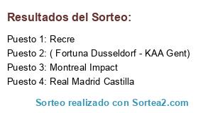 Lista de participantes: Real Madrid Castilla, Montreal Impact, Recre, ( Fortuna Dusseldorf - KAA Gent).