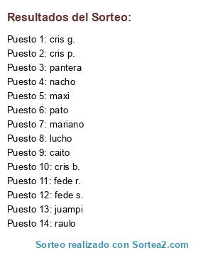 Lista de participantes: fede r., nacho, maxi, raulo, cris g., cris p., cris b., pato, pantera, caito, juampi, mariano, fede s., lucho.