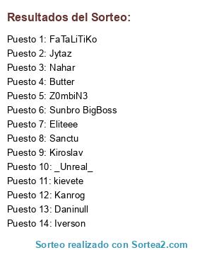 Lista de participantes: Kiroslav, Z0mbiN3, Kanrog, FaTaLiTiKo, Sunbro BigBoss, kievete, Eliteee, Sanctu, Iverson, Butter, Nahar, Daninull, Jytaz, _Unreal_.