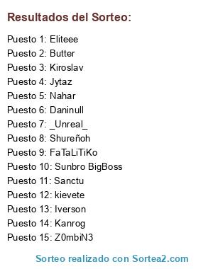 Lista de participantes: Kiroslav, Z0mbiN3, Kanrog, FaTaLiTiKo, Sunbro BigBoss, kievete, Eliteee, Sanctu, Iverson, Butter, Nahar, Daninull, Jytaz, _Unreal_, Shureñoh.