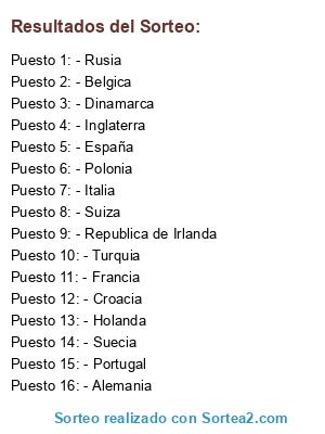 Lista de participantes: - Alemania, - Rusia, - Holanda, - Portugal, - Croacia, - Italia, - España, - Inglaterra, - Francia, - Belgica, - Polonia, - Republica de Irlanda, - Suecia, - Suiza, - Turquia, - Dinamarca.